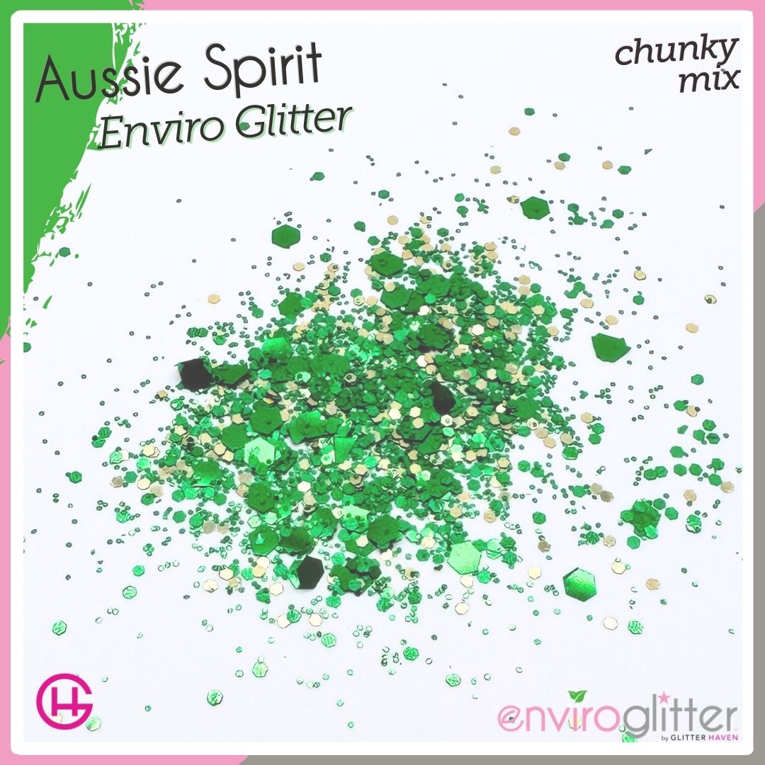 Aussie Spirit Enviro Glitter by Glitter HavenĀ is a beautiful blend of our vibrant green and subtle golden compost biodegradable glitters in a mixed particle size.