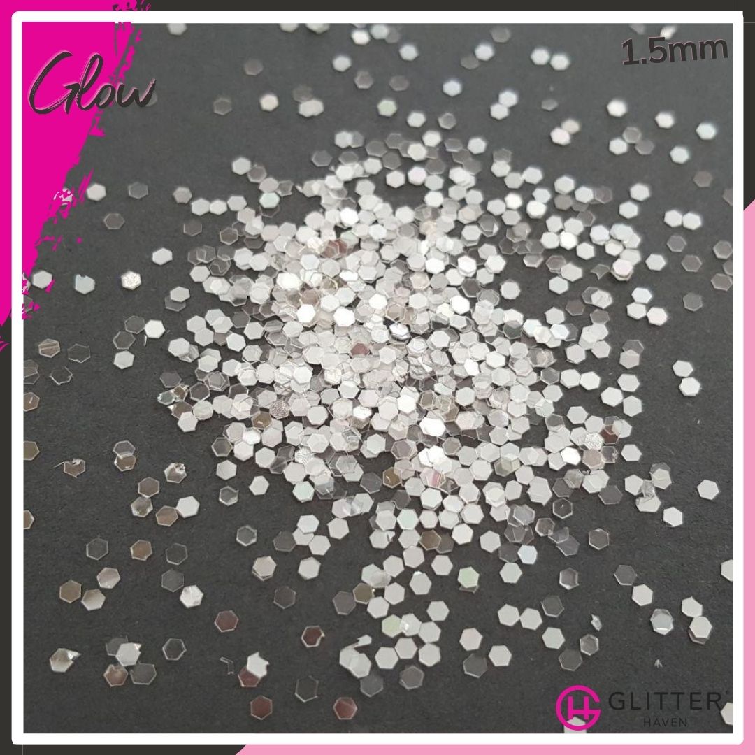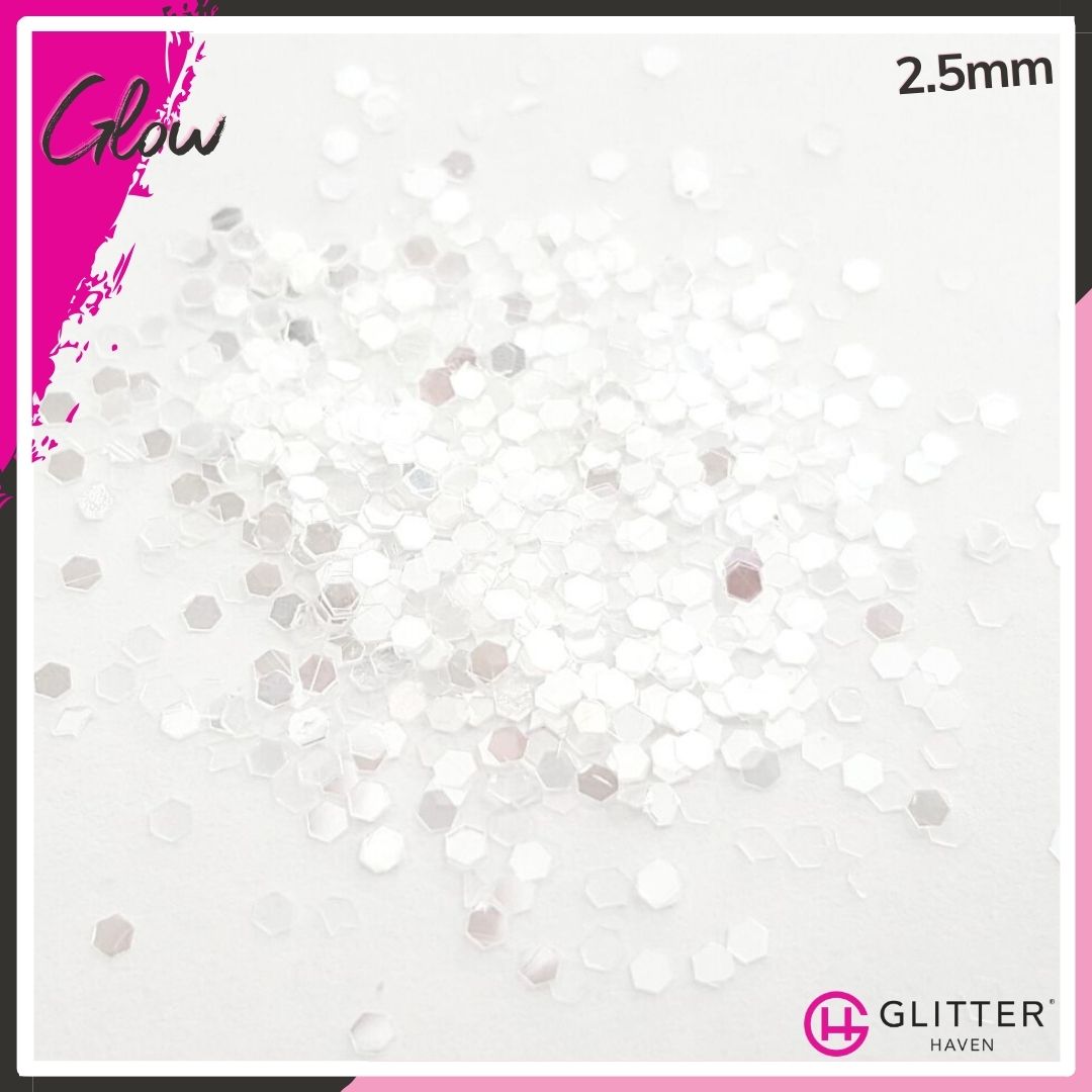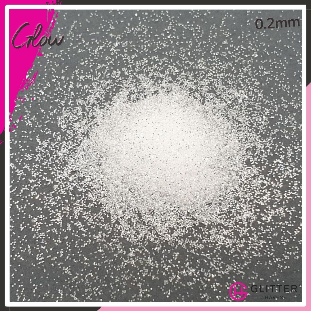 This white glitter is a sparkly dream. Glow is a fabulous cool white, semi-translucent glitter, that reflects a pale, almost mirror-like silver in all particle sizes. You never know if you will Glow white or silver, but you will be divine.