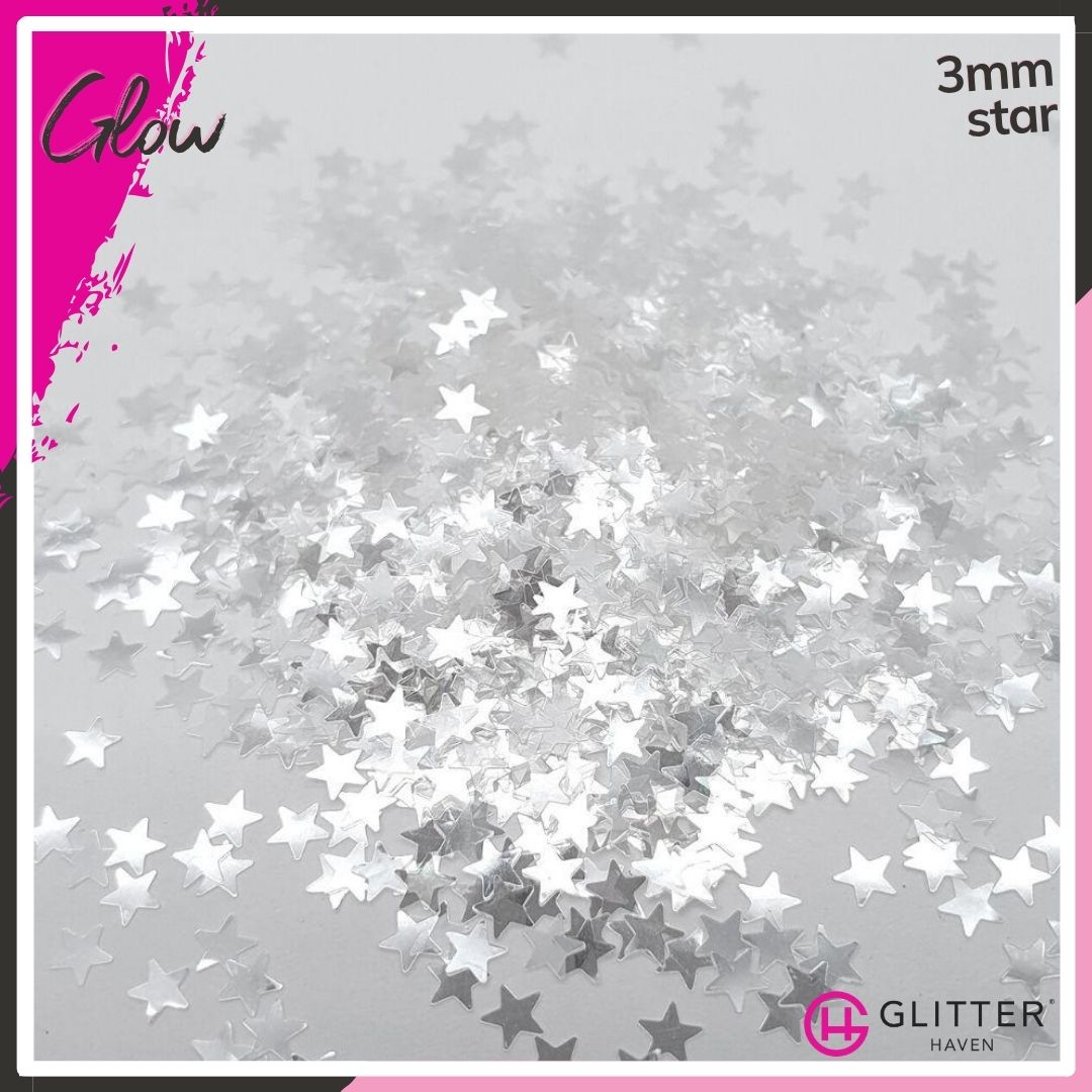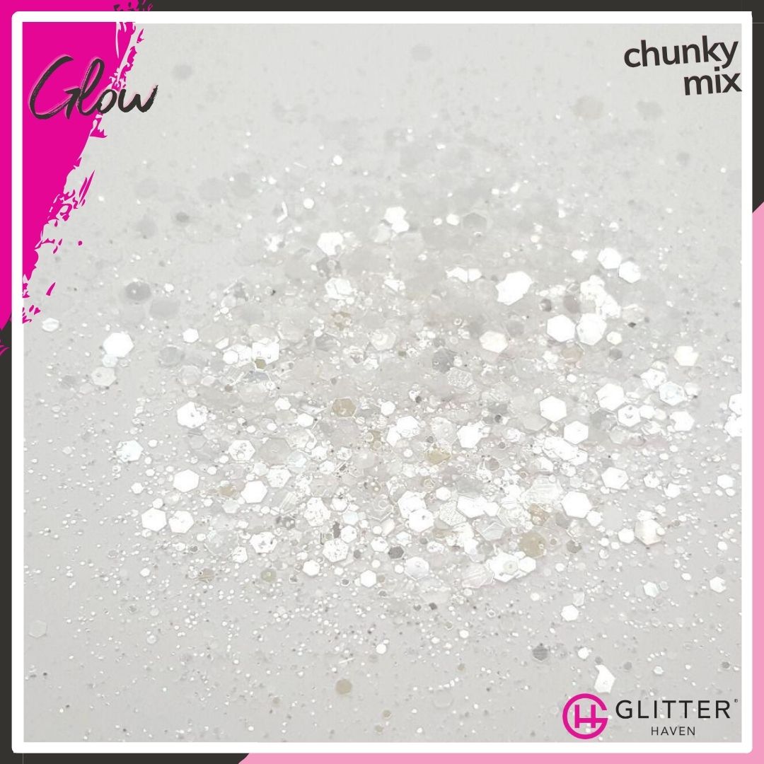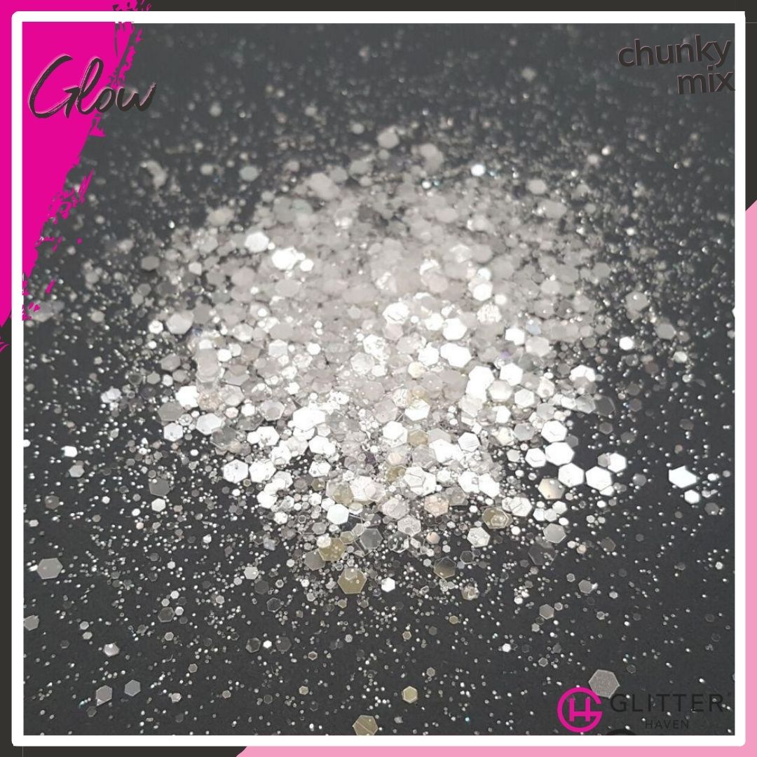 This white glitter is a sparkly dream. Glow is a fabulous cool white, semi-translucent glitter, that reflects a pale, almost mirror-like silver in all particle sizes. You never know if you will Glow white or silver, but you will be divine.