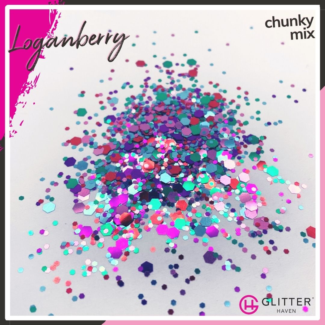 This beautiful blend of pink, purple, pale blue and green in mixed particle sizes is called Loganberry. Shiny and shimmery, but not holographic or iridescent, the glitter will suit any project looking for a pretty pop. Why not try some glitter roots, and matching face accents!