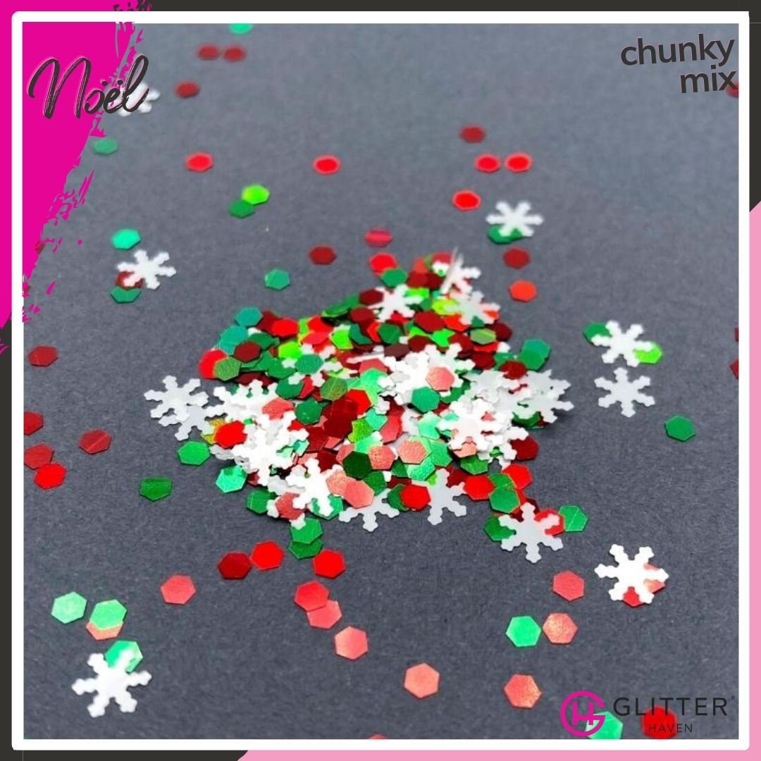Noël is a large particle blend with vibrant reds, gorgeous greens and bright white 8mm snowflakes. It is sure to instill the Christmas spirit all year round.