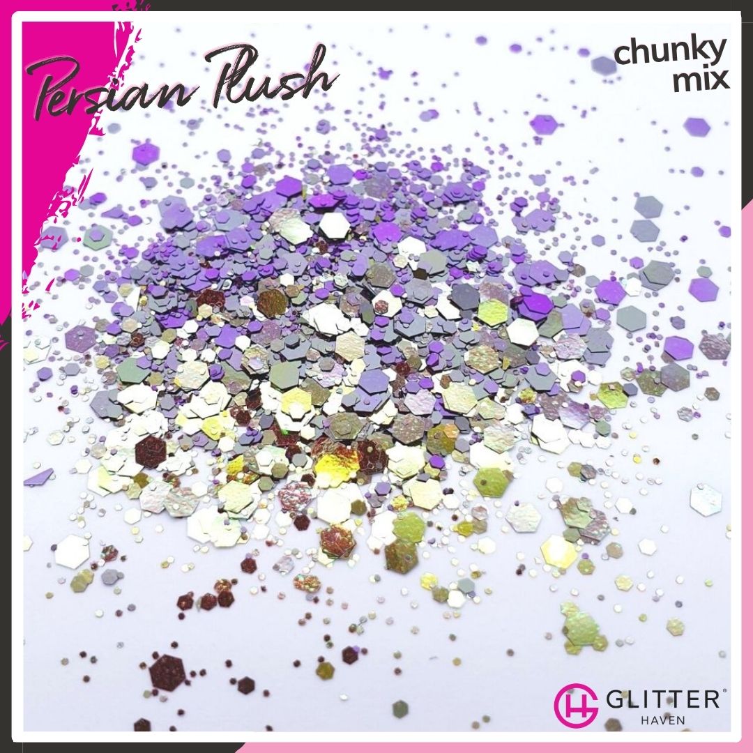 With colours generally seen in the Persian palace, this amazing chameleon colour shift glitter is called Persian Plush. Its mixed size particles are a brilliant silvery purple changing to a majestic gold. This glitter can be used on nails, with makeup, resin, and many other crafts.