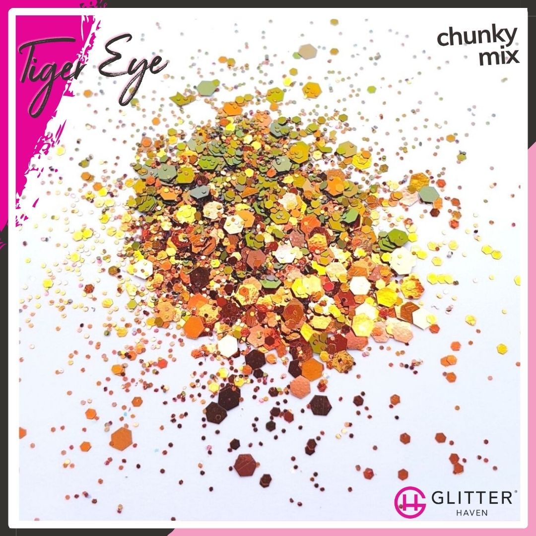 A chameleon colour shift glitter, Tiger Eye changes between an orangey-bronze to a golden hazel-green depending on the angle of viewing. Let this beast into your glitter collection.